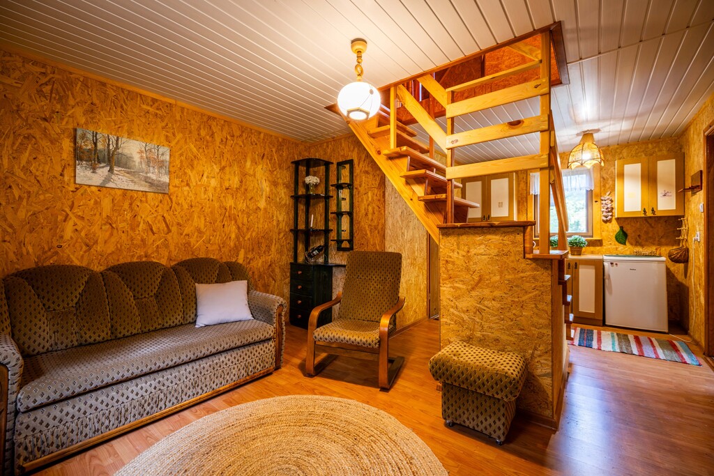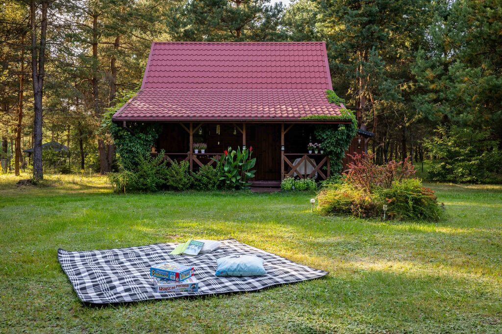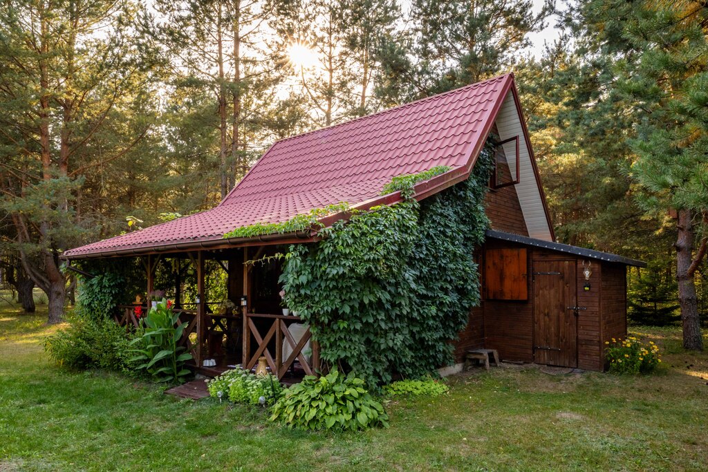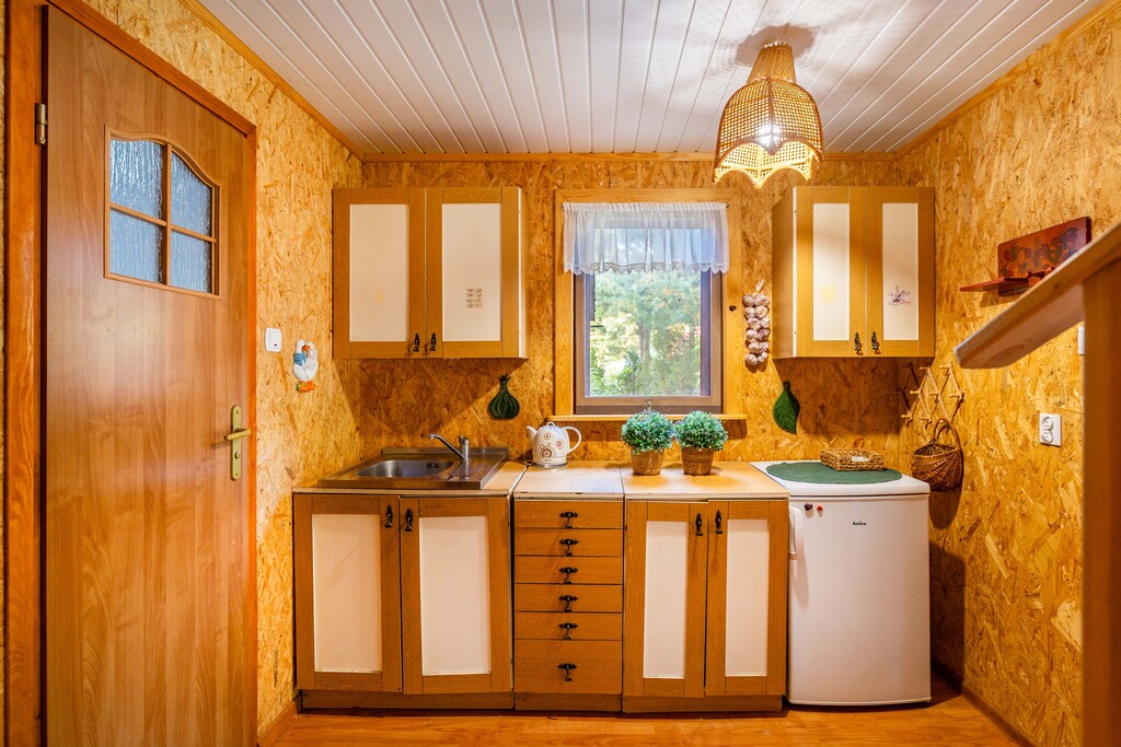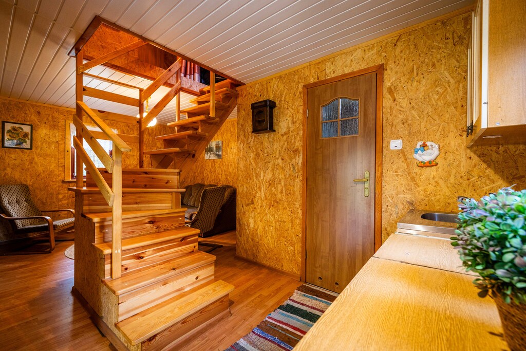 Drewniany domek o powierzchni 25 m² zbudowany w 2009 r., pokryty blachą. Okna i okiennice drewniane. Ściany zewnętrzne docieplone wełną mineralną. Ściany wewnętrzne obite OSB, na podłogach panele. W kuchni podstawowe meble, lodówka, zlew, kuchenka indukcyjna (przenośna). Na parterze mały salonik, na poddaszu dwie sypialnie i miejsce na przechowywanie. Łazienka z prysznicem. Woda ogrzewana bojlerem. Obok domku pomieszczenie gospodarcze, niezbędne do przechowywana narzędzi ogrodowych czy rowerów.