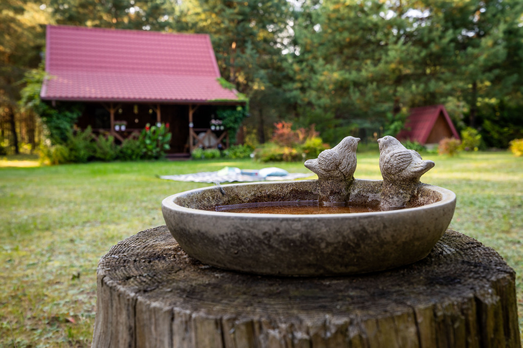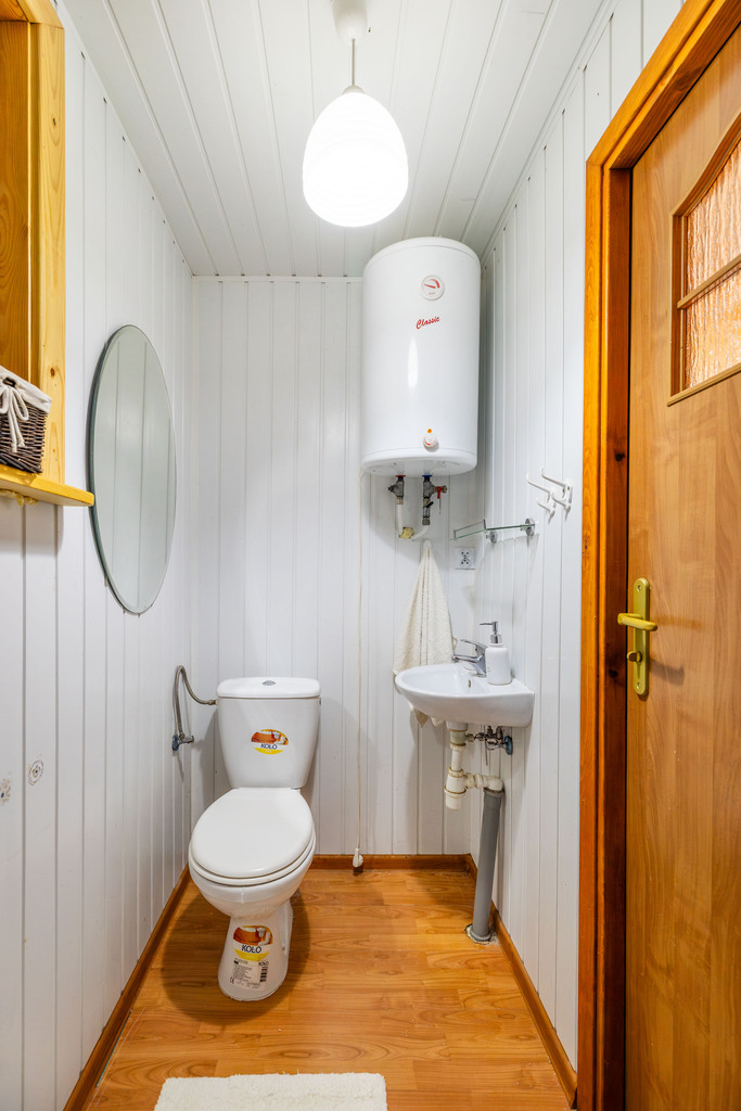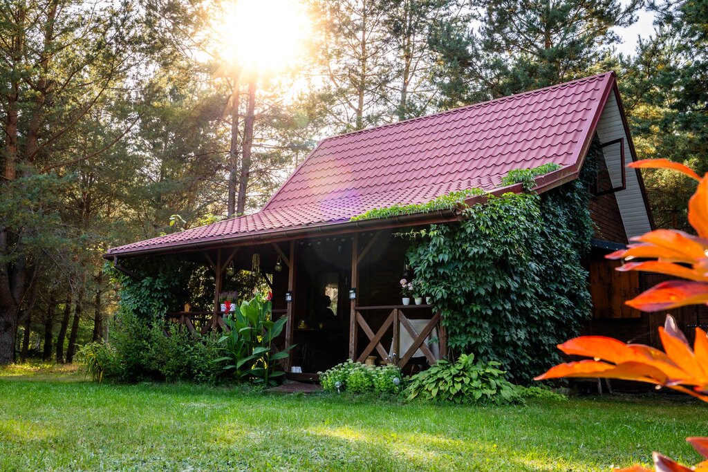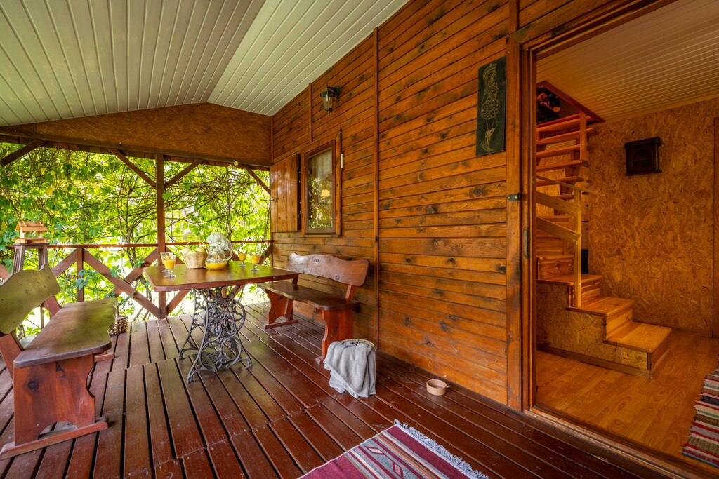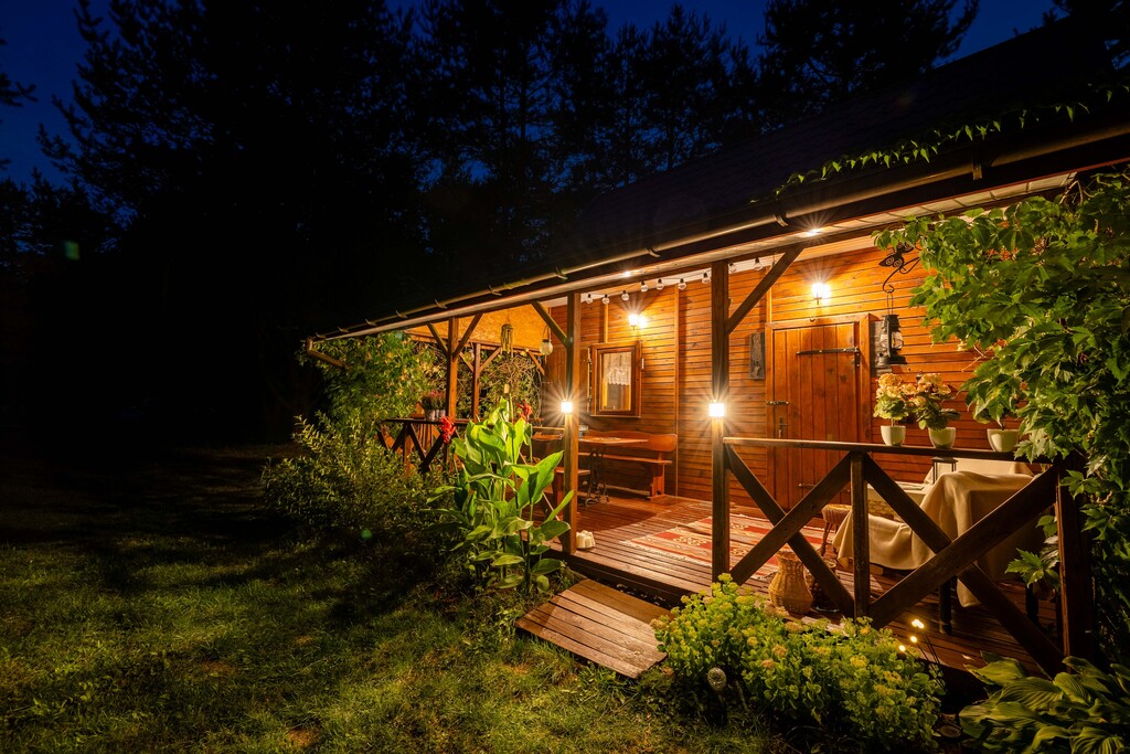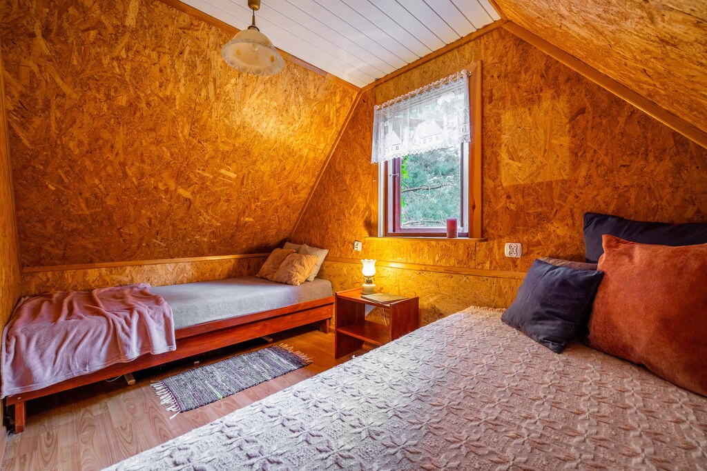 Drewniany domek o powierzchni 25 m² zbudowany w 2009 r., pokryty blachą. Okna i okiennice drewniane. Ściany zewnętrzne docieplone wełną mineralną. Ściany wewnętrzne obite OSB, na podłogach panele. W kuchni podstawowe meble, lodówka, zlew, kuchenka indukcyjna (przenośna). Na parterze mały salonik, na poddaszu dwie sypialnie i miejsce na przechowywanie. Łazienka z prysznicem. Woda ogrzewana bojlerem. Obok domku pomieszczenie gospodarcze, niezbędne do przechowywana narzędzi ogrodowych czy rowerów.