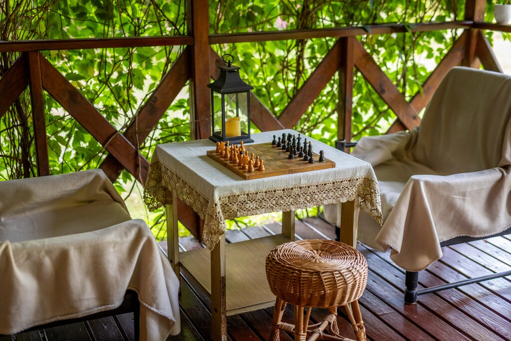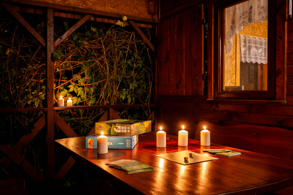 Obrośnięty winoroślą, duży taras doskonały zarówno do spożywania posiłków, jak i spędzania wolnego czasu, także po zmroku.