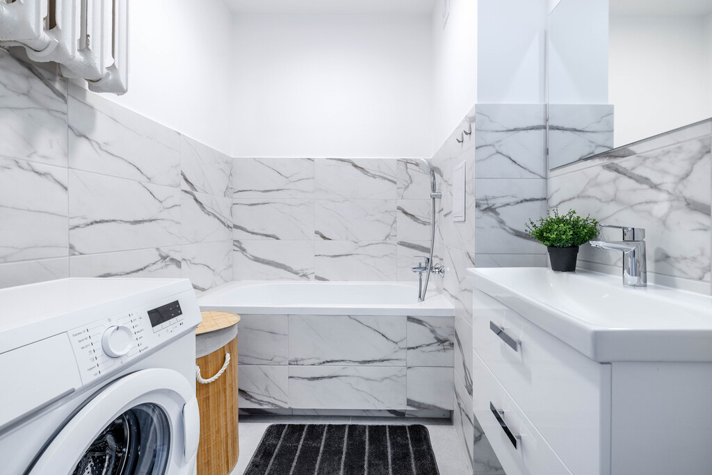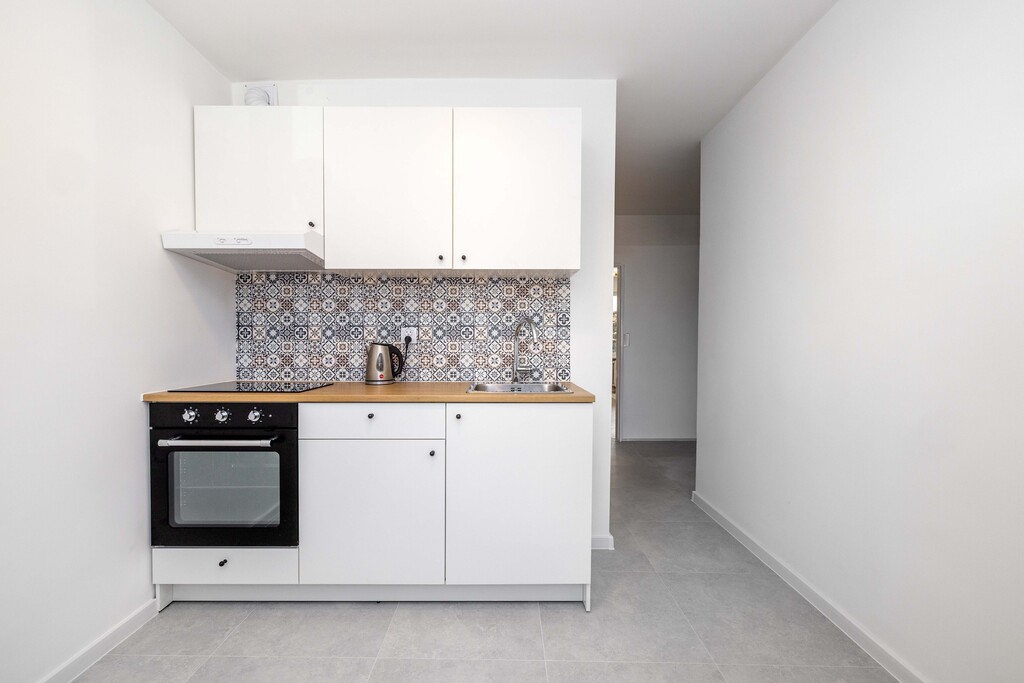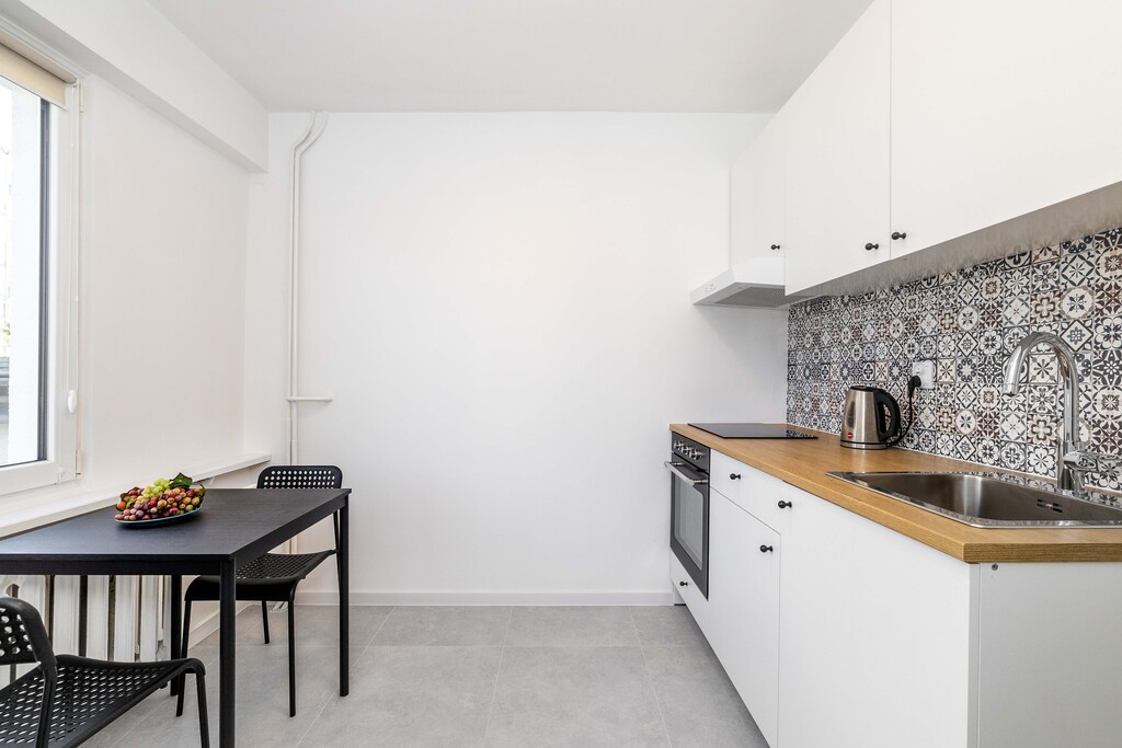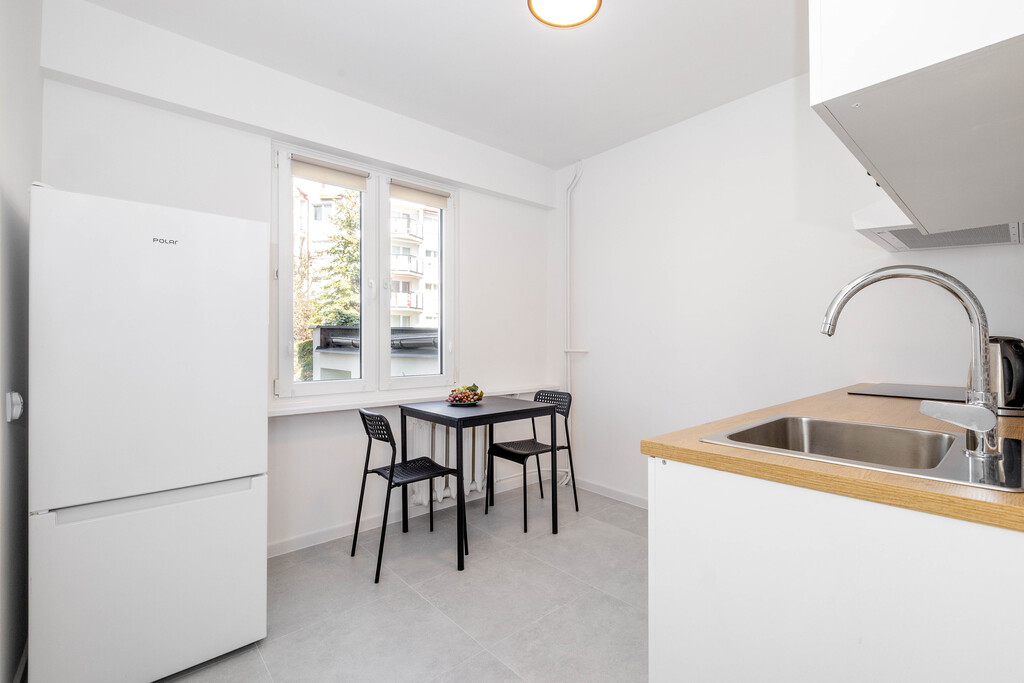 Na wyposażeniu meble oraz sprzęt AGD – płyta indukcyjna, piekarnik elektryczny, lodówka z zamrażalką, pralka.